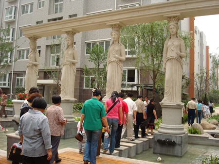 第三站准业主们来到了以月亮文化为主题的楼盘。现已被评为全国示范住宅小区;的月亮园住宅区,准业主们看到了小区保安的训练有素、小区物业管理到位、地面清洁无一张纸屑,家家户户窗明几净,推开单元安全门,楼梯上一尘不染