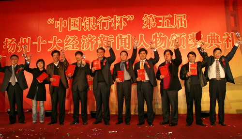 一年一度的十大经济新闻人物;评选,堪称扬州经济奥斯卡;。 3月17日,由扬州市经贸委、扬州日报社主办,团市委、扬州晚报、扬大经济学院承办的中国银行杯;扬州十大经济新闻人物;颁奖典礼在迎宾馆隆重举行。市委常委、宣传部长袁秋年,市人大常委会副主任孙永如,副市长王玉新,市政协副主席朱正海出席颁奖典礼。
