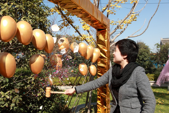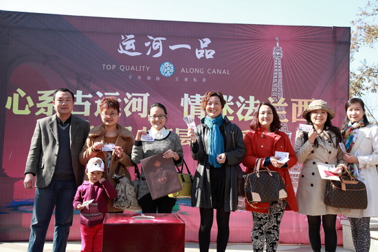 2013年11月17日上午,运河一品售楼中心举办了心系古运河,情迷法兰西;开盘预热活动,邀请了前期预约的客户及亲友前来参与,活动汇集了购房砸金蛋;、亲友助力大转盘;、DIY花艺;、精彩表演;、精美茶歇;等多彩项目,客户参与度高,互动性强,客户在愉快的氛围中得到了不同幅度的购房补贴,喜满客电影票和香格里拉自助餐券,场面十分火爆。