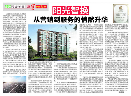 阳光智换;提出的置换+质换;的概念,是对房地产营销模式的一种颠覆!它把房地产营销从开发商角度出发的销售模式转换成从业主角度出发的服务模式,从理财需求和服务需求两方面契合业主需要,把及时、方便、利益、舒适、快捷留给业主,把省事、省心、省时、省力带给业主,从高品质物业衍生而来的高品质服务,让阳光美第先声夺人!