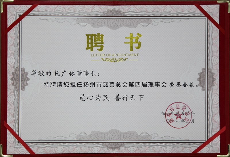 326下午,扬州市慈善总会第四次会员代表大会召开,选举产生第四届理事会、监事会成员。市委书记夏心旻出席会议并讲话。省慈善总会执行副会长刘成林、副会长章大李到会祝贺。江苏新能源置业集团董事长包广林获聘市慈善总会荣誉会长,并接受了获聘证书。